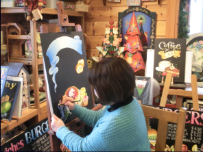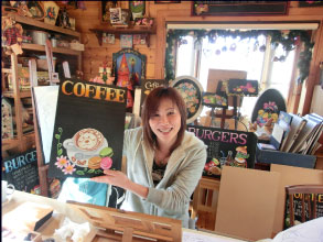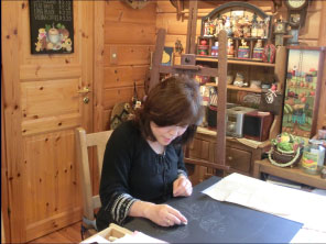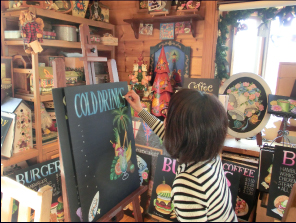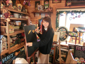私の今までは、いろいろな手仕事のお稽古三昧の年月でした。針を持つことが好きで刺繍、縮緬細工、パッチワークなどをしてきました。針の次には筆に変えトールペインティングを楽しみ、生徒さんたちに教えてきました。サンフランシスコのカフェでメニューボードに出会い、一体何を使って描いているんだろうと興味がわきました。帰ってからオイルパステルで描くチョークアートだと知りました。数少ないチョークの色を黒いボードの上にのせて筆も使わず指でブレンディングして、悩みながらも少しずつ本物に近づけていきます。出来上がったときには、達成感で喜びに変わります。今までの縮緬細工などでの「和」の作品制作の経験や、チョークアートとトールペインティングとの融合など私なりの感覚で作品を制作しています。